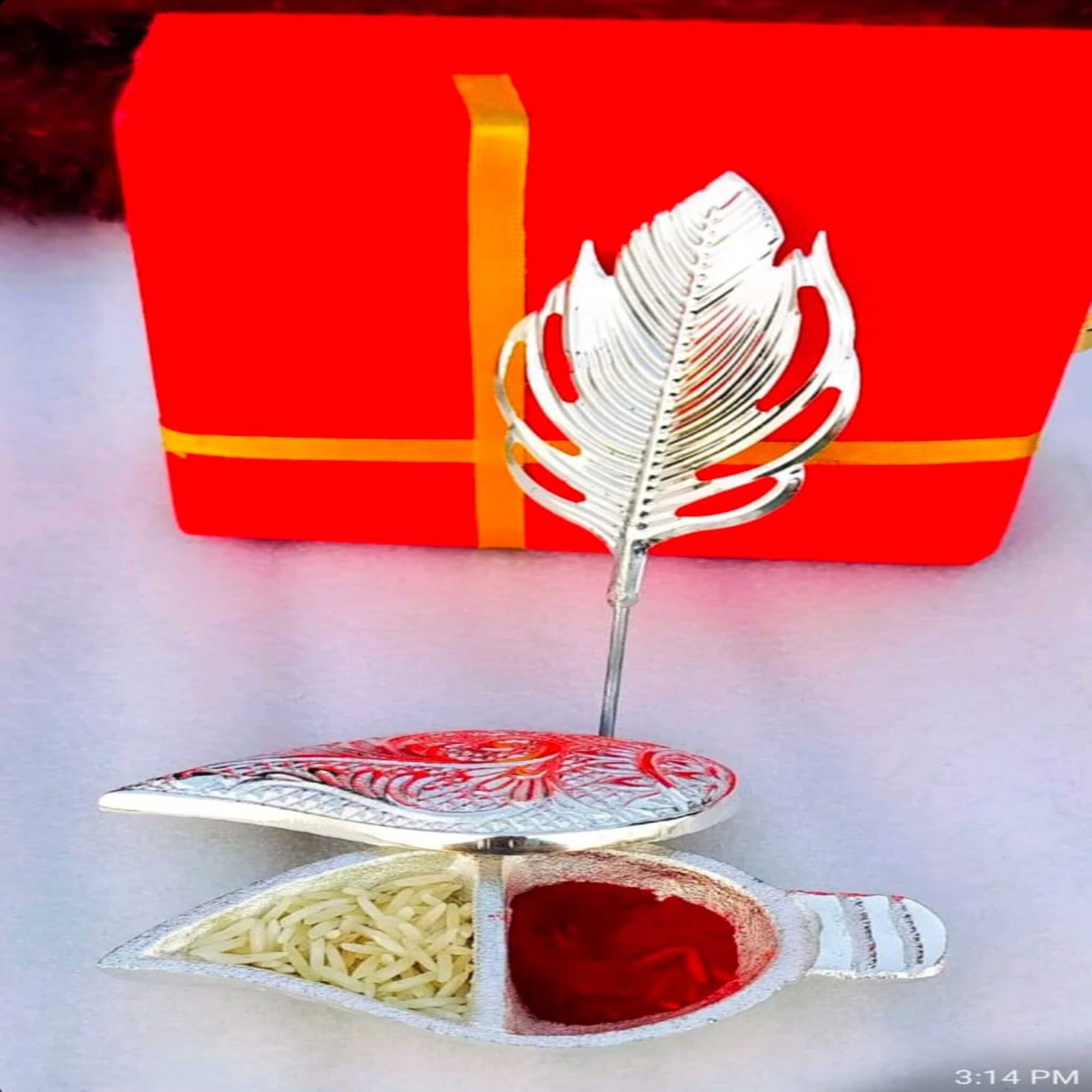 Add a traditional touch to your rituals with this beautifully crafted Metal Kumkum Diya. Designed with intricate detailing and a dual compartment for kumkum and rice, it combines functionality with elegance. The attached feather-shaped handle adds a graceful charm, making it a perfect centerpiece for pooja thalis or festive decorations. Ideal for daily worship, housewarming, Diwali celebrations, or as a thoughtful religious gift. Durable, lightweight, and easy to maintain, this diya reflects true Indian artistry.